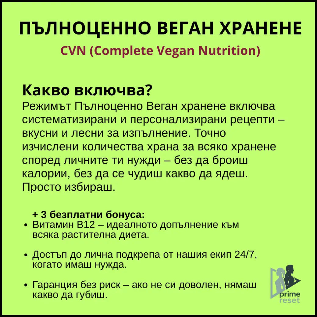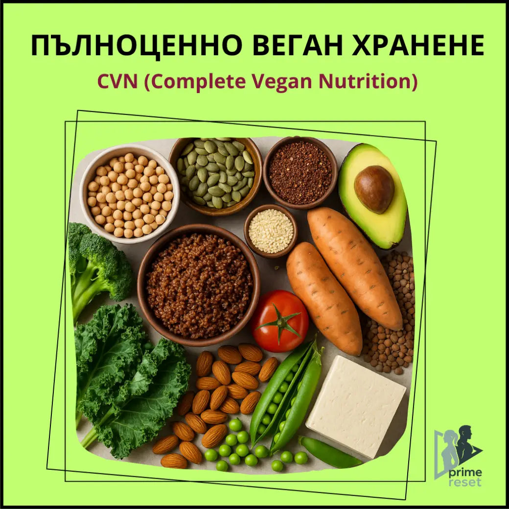 Системата CVN (Complete Vegan Nutrition) е научно обоснована и е създадена, за да осигури практичен и балансиран подход към храненето с растителна храна - оптимален прием на тези ключови нутриенти (витамин B12 и протеин) чрез пълноценни и и вкусни ястия.